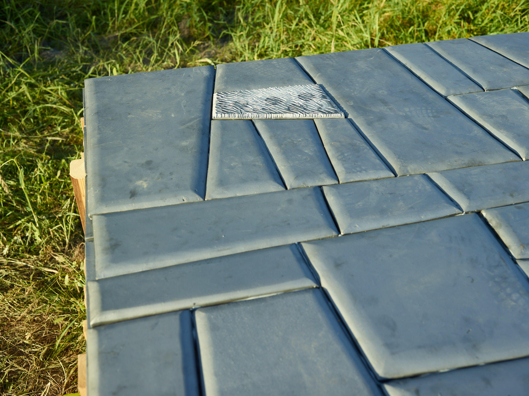 ・観世音寺のコスモス畑に設置された鬼瓦と廃材で造られたベンチ